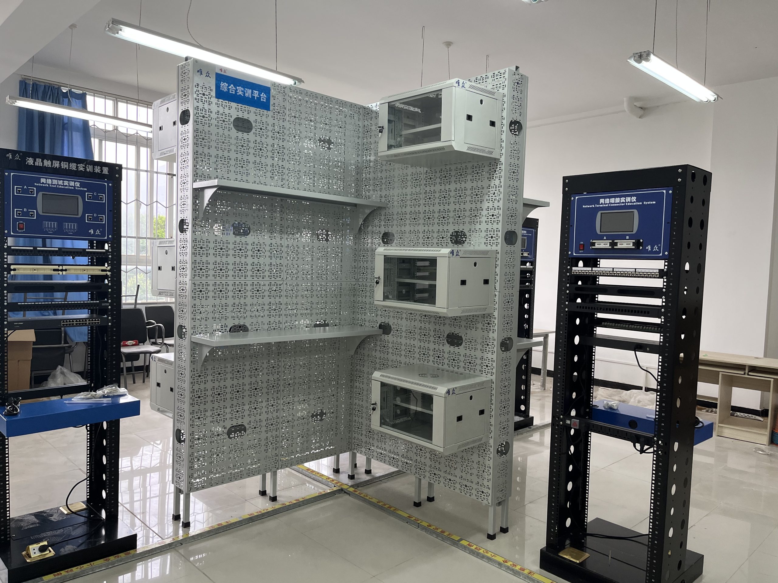 唯众综合布线实训基地本着建成集“教、学、做”为一体的教学环境和校内生产性实训基地的理念,从演示实践教学、基本技能训练实践教学、工程项目实训实践教学三个层面为综合布线技术课程教学提供了整体实践教学解决方案,其基于综合布线工程工作过程的工程项目实训教学充分体现了职业教育的特点。实训基地能完成从设计、安装、测试到验收的综合布线、计算机网络、物联网工程全过程的教学任务,使学生对抽象的计算机类系统工程知识有了直观生动的认识,通过基本技能实训和工程项目综合训练,培养学生从事楼宇智能领域、计算机网络和物联网领域岗位的职业能力。