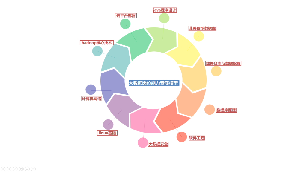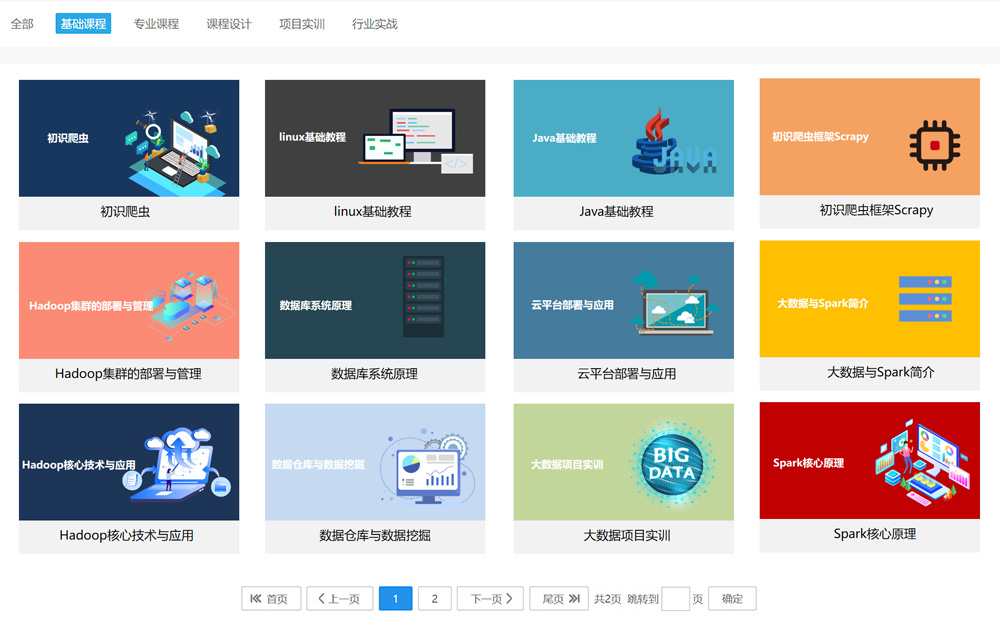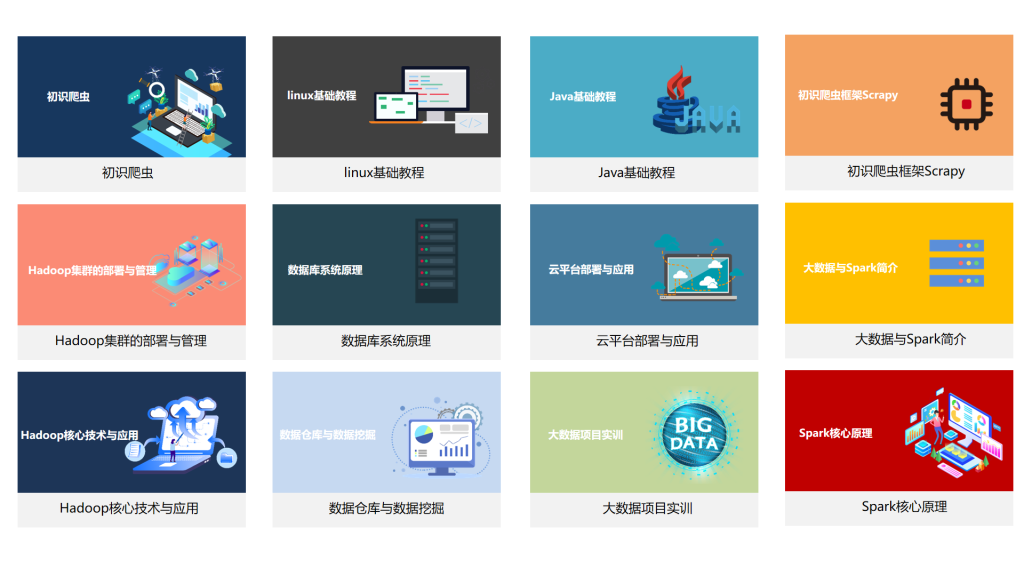 大数据行业需求为导向、以工程实践为背景、以教学规范为标准、以能力培养为主线所构建的课程体系,共计有40门课程,其中基础课程10门、核心课程20门、实训实战课程10门,PPT 200个,视频100个,实验300个,其中实训实战课程配备不低于1000万条数据。