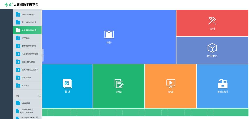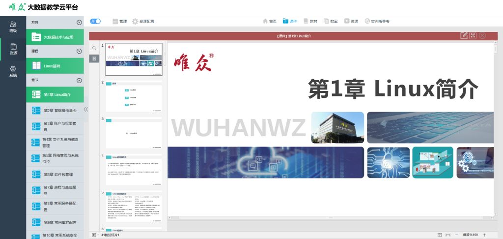 大数据教学云平台是一个开放式的课程平台,除了唯众的课程体系之外,老师可自主开发在线课程,支持Word、PPT、PDF、视频等常见课件直接转换成在线课程,从而让老师很方便的将专业基础课程迁移到平台上,便于构建完整的大数据、云计算、人工智能专业课程体系。平台内置丰富的教学实训资源,将教学与实训完美集合,依托平台打造最前沿的综合一站式实践基地。