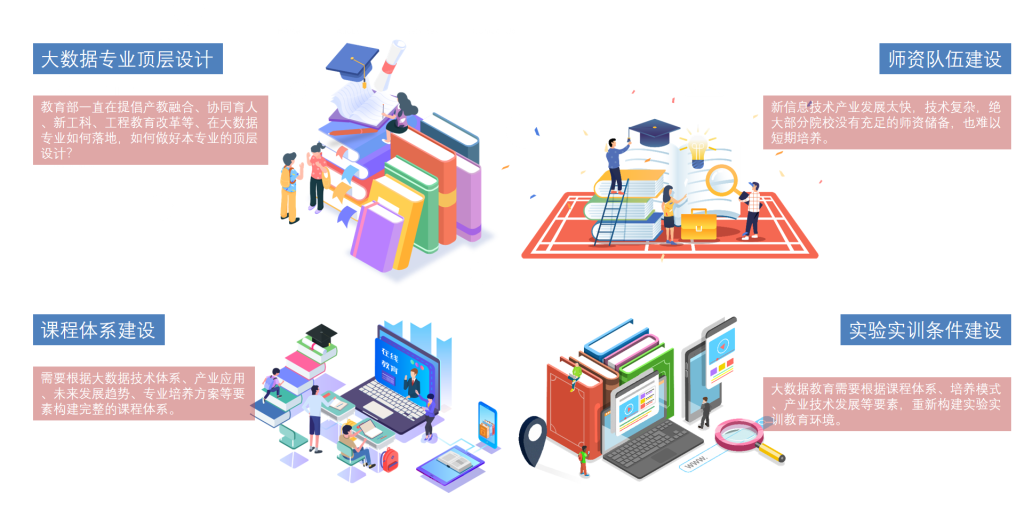 大数据、信息安全、人工智能等新信息技术产业发展迅猛,人才极其匮乏,各个本科及职业院校纷纷开设相应的专业方向。但是,绝大多数院校因为师资和积累问题,在专业建设规划、办学特色提炼、创新教学模式落地、师资团队建设、课程体系建设、实训条件建设等方面存在困难。