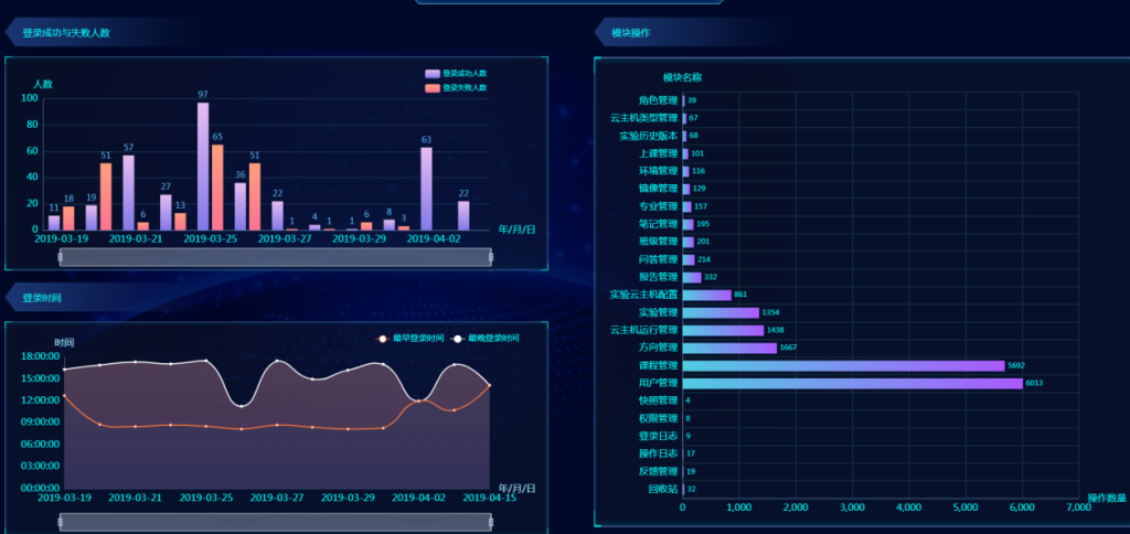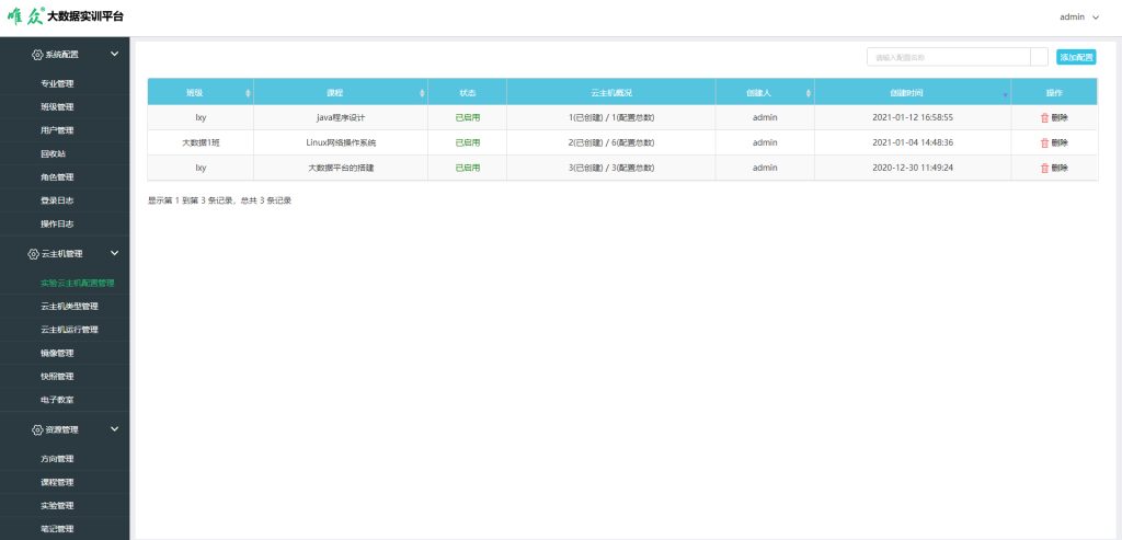 大数据项目实训平台集成虚拟化模版功能,内置Hadoop、Spark、TensorFlow、Caffe等主流的大数据、云计算和人工智能学习开发环境,可通过模版快速批量地为学生准备好实训环境。支持多门大数据课程同时开展实训,平台可按课程自动准备各个课程所需虚拟机,学生登录系统后可直接开展实训。