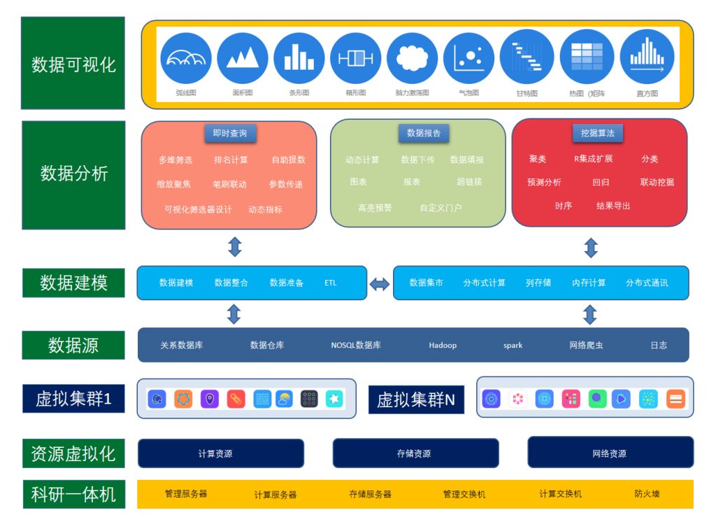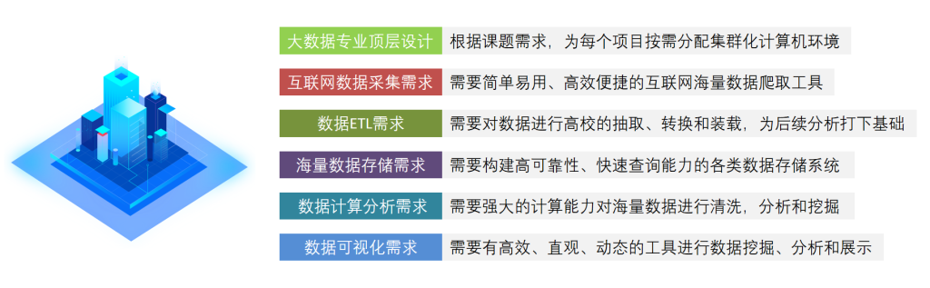 作为高科技人才的培养摇篮和大数据前沿技术攻关阵地,高校需要承担起大量的大数据相关科研任务和高层次研究型人才培养责任,传统的计算机和服务器在大数据科研项目管理、科研环境构建、科研成果展示等方面都存在短板。当前,为有效支撑师资团队的科研和人才培养,对科研平台有以下要求: