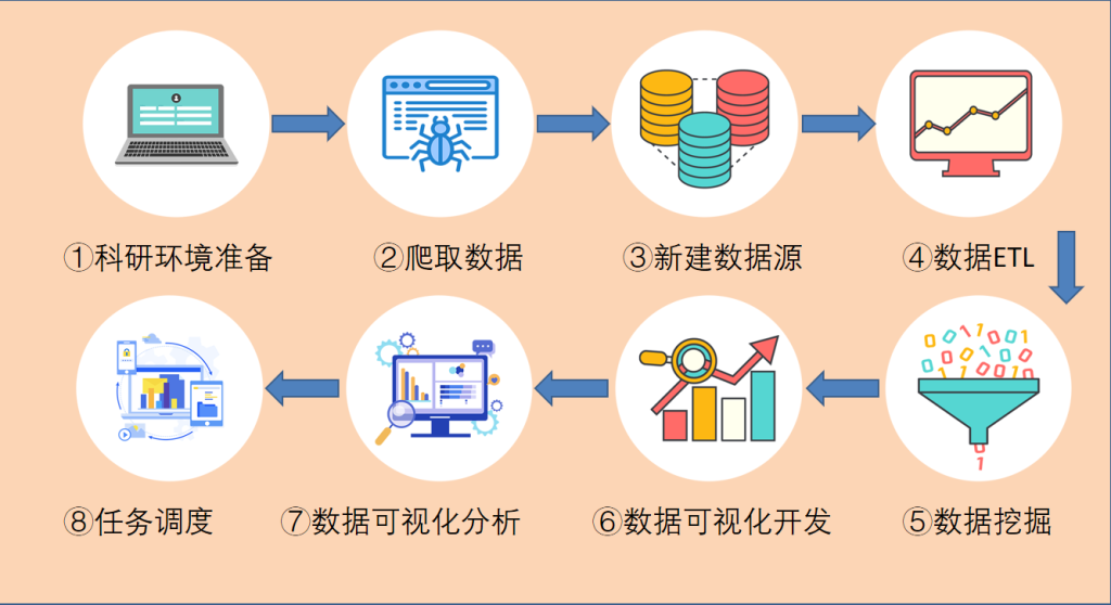 基于唯众大数据创新科研平台,科研团队通过以下8个步骤,快速完成大数据科研环境准备、数据爬取、数据源接入、数据ETL、数据挖掘、数据分析、数据可视化和动态任务调度等过程。