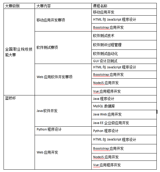 大数据及软件教学与实验教学资源包含专业课程专业基础课程计算机应用基础、静态网页设计与制作、C 语言程序设计、数据结构、HTML5 + CSS3 Web 前端开发技术、计算机专业英语等;专业核心课程分为 Java 开发、.Net 开发、We 前端开发三个方向,每个方向分别设置专业核心课程,各方向之间可实现课程共享。各方向专业核心课程如下: