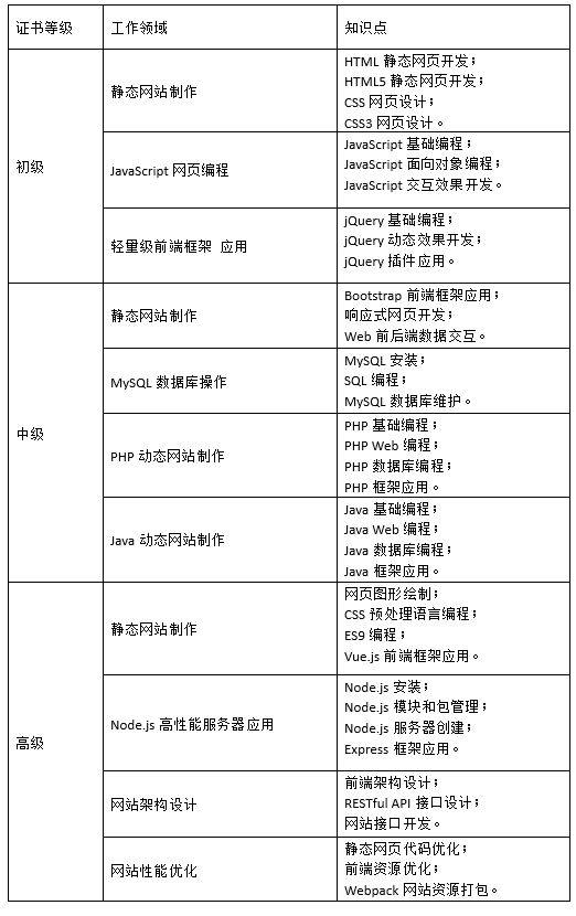 培养具有良好职业道德和人文素养,掌握web前后端数据交互、响应式开发等知识,具备动态网页设计、开发、调试、维护等能力,能从事web前端软件编程、软件测试、软件技术服务、智能终端界面开发等工作的中级技术技能人才。