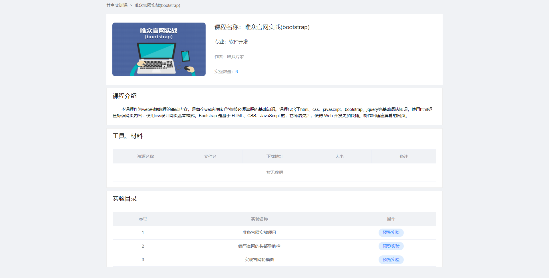 内置公共资源课程,便于老师教学:软件开发模块可内置完整的实训资源,其中包括实训文档以及在线资源包,用户可以直接进行使用。