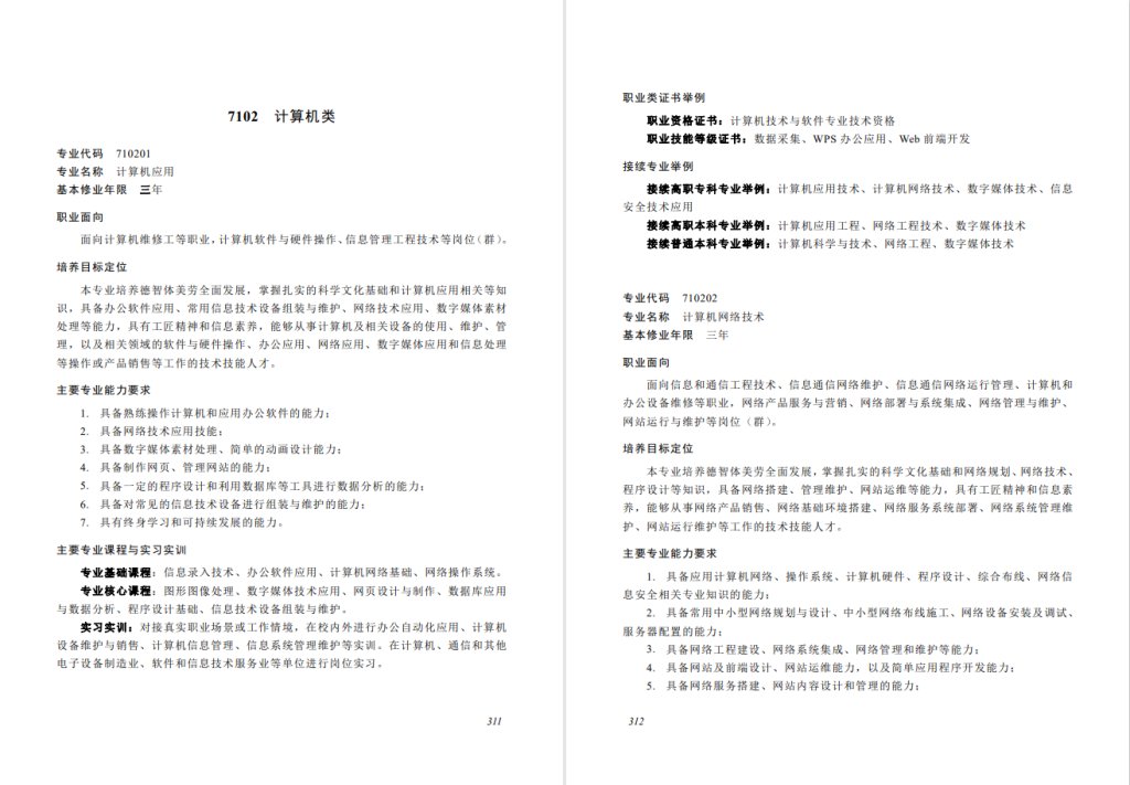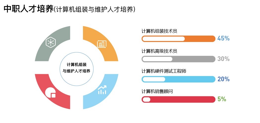 面向计算机技术的组装、维护、应用领域,培养从事计算机及相关设备的使用、维护、管理,以及相关领域的软件与硬件操作、办公应用、网络应用、多媒体应用和信息处理等操作或产品销售,德智体美全面发展的高素质劳动者和技能型人才。