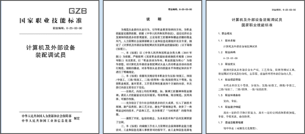 国家职业技能标准——计算机及外部设备装配调试员。