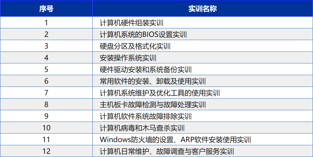 | 软件安装 | 操作系统和应用软件装配调试 | Windows安装、Linux安装、Windows Server安装,硬件驱动安装,IPv4、IPv6和网关设置,操作系统与应用软件使用与更新,BIOS设置 |