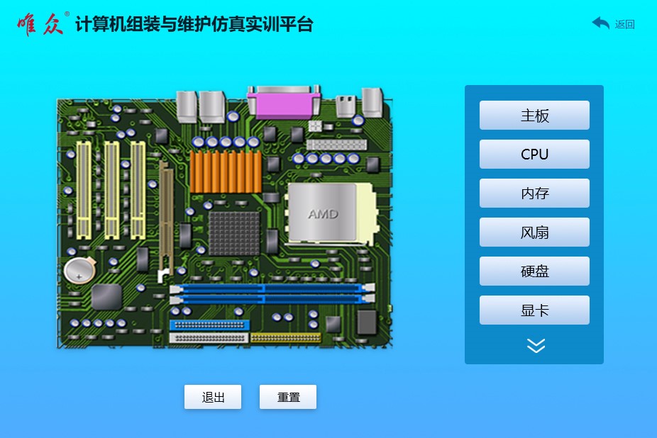 在软件平台上能完成器件认知、硬件组装、操作系统安装、计算机故障排查、计算机常用软件安装与维护等,可支持各类计算机应用教学实验成果展示。具体功能要求: