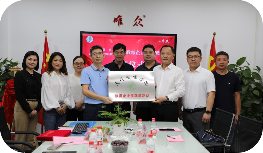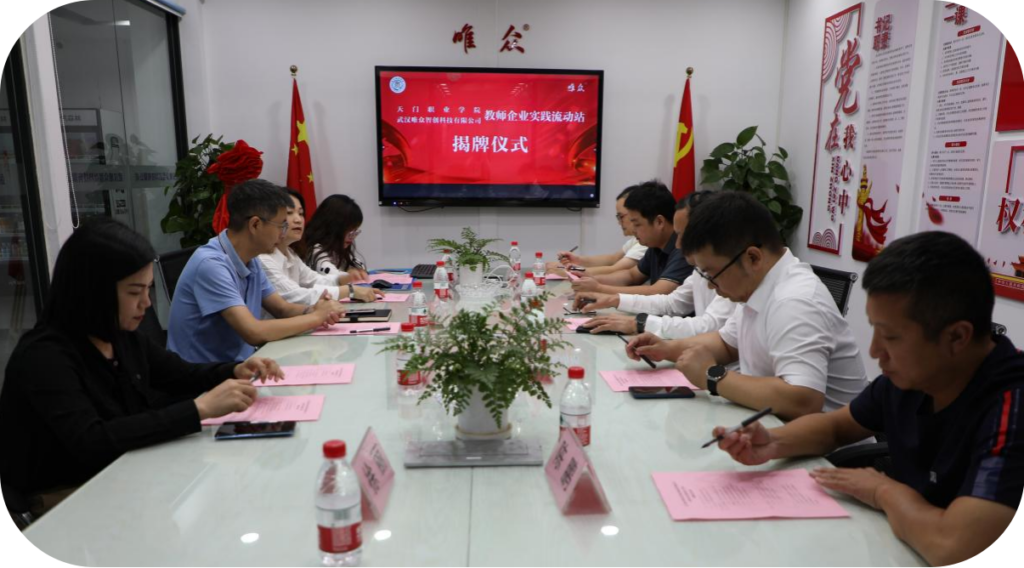2023年9月21日,天门职业学院校长熊安峰、教务处处长田刚、招生就业处处长郭绍南、智能制造学院院长陈鹏、电子信息技术学院副院长李文莉、办公室副主任肖尧、招生就业处科长徐丽一行人员来访武汉唯众智创科技有限公司,签订共建“产学研”一体化人才培养基地校企合作协议书,并参与天门职业学院·唯众“教师企业实践流动站”揭牌仪式。公司创始人辜渝傧及管理团队表示热烈欢迎。