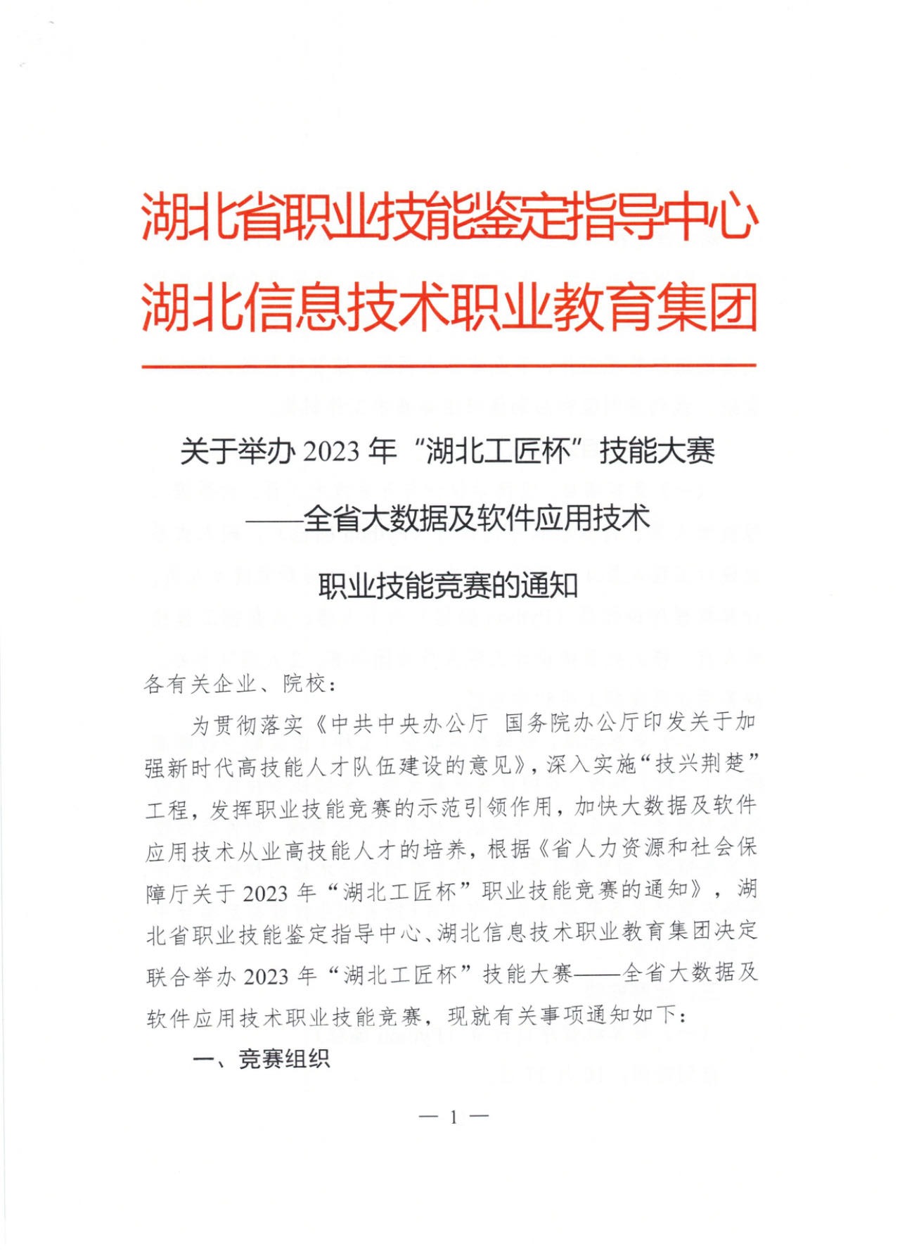 为贯彻落实《中共中央办公厅国务院办公厅印发关于加强新时代高技能人才队伍建设的意见》,深入实施“技兴荆楚工程,发挥职业技能竞赛的示范引领作用,加快大数据及软件应用技术从业高技能人才的培养,根据《省人力资源和社会保障厅关于2023年“湖北工匠杯”职业技能竞赛的通知》,湖北省职业技能鉴定指导中心、湖北信息技术职业教育集团决定联合举办 2023年“湖北工匠杯”技能大赛–全省大数据及软件应用技术职业技能竞赛,现就有关事项通知如下:
