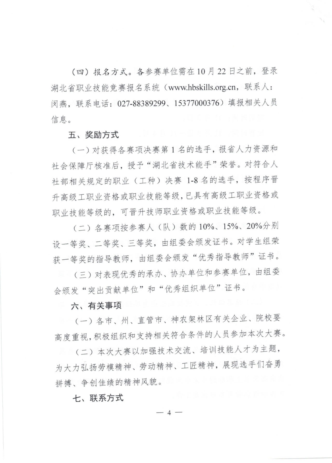 (四) 报名方式。各参赛单位需在10月22日之前,登录湖北省职业技能竞赛报名系统(wwwhbskills.org.cn,联系人:闵燕,联系电话:027-88389299、15377000376)填报相关人员信息。