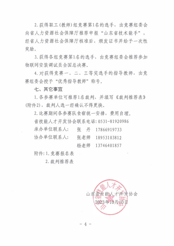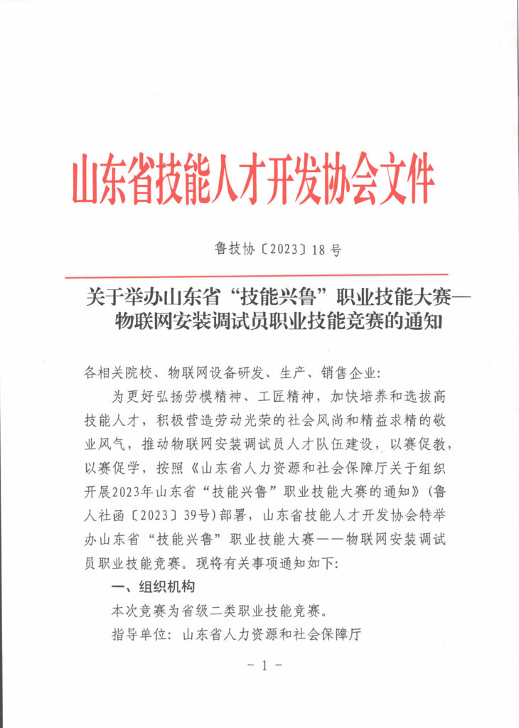 为更好弘扬劳模精神、工匠精神,加快培养和选拔高技能人才,积极营造劳动光荣的社会风尚和精益求精的敬业风气,推动物联网安装调试员人才队伍建设,以赛促教,以赛促学,按照《山东省人力资源和社会保障厅关于组织开展2023年山东省“技能兴鲁”职业技能大赛的通知》(鲁人社函〔2023〕39号)部署,山东省技能人才开发协会特举办山东省“技能兴鲁”职业技能大赛——物联网安装调试员职业技能竞赛。现将有关事项通知如下:
