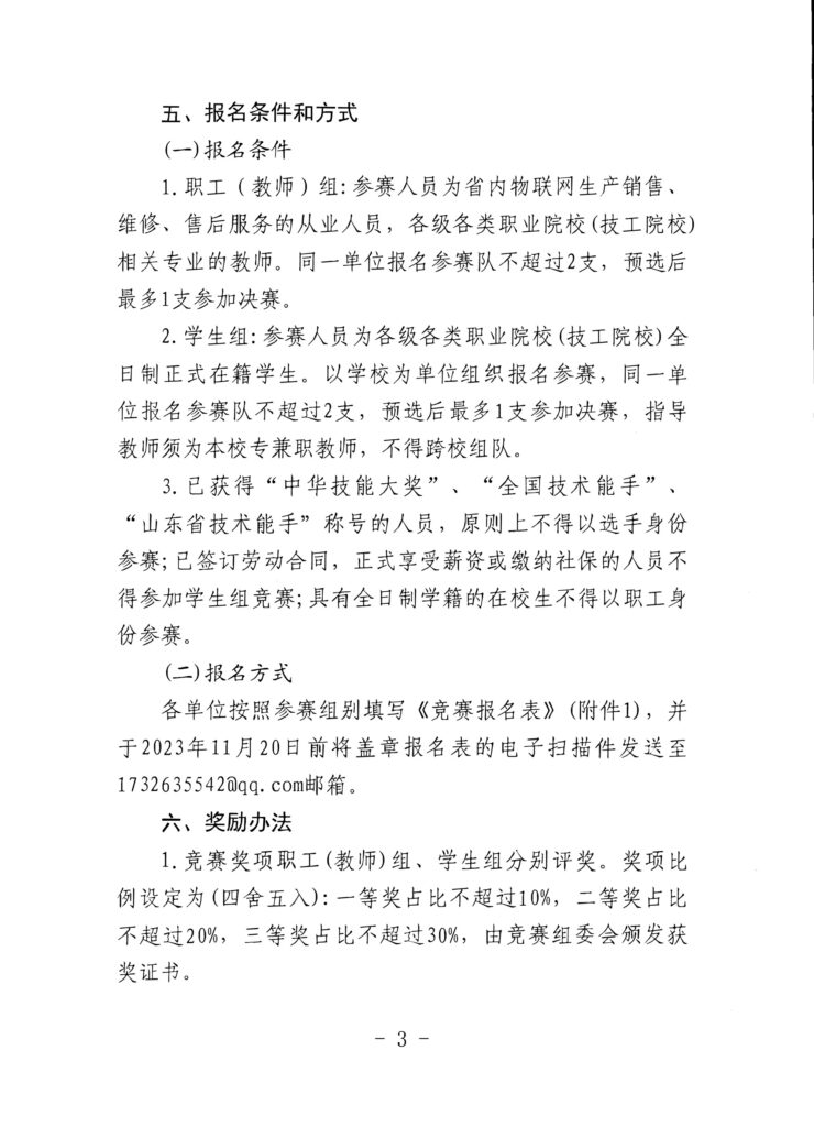 1.职工(教师)组:参赛人员为省内物联网生产销售、维修、售后服务的从业人员,各级各类职业院校(技工院校)相关专业的教师。同一单位报名参赛队不超过2支,预选后最多1支参加决赛。