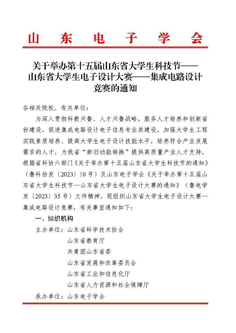 为深入贯彻科教兴鲁、人才兴鲁战略,服务人才培养和创新省份建设,促进集成电路设计电子信息专业类建设,加强大学生工程实践素质培养、提高大学生电子设计技能水平,培养符合产业发展需求的人才,为我省“新旧动能转换”提供高质量产业人才支持,根据省科协六部门《关于举办第十五届山东省大学生科技节的通知》(鲁科协发〔2023〕10号)及山东电子学会《关于举办第十五届山东省大学生科技节–山东省大学生电子设计大赛的通知》(鲁电学发〔2023〕35号)文件精神,现组织山东省大学生电子设计大赛–集成电路设计竞赛,有关事宜通知如下: