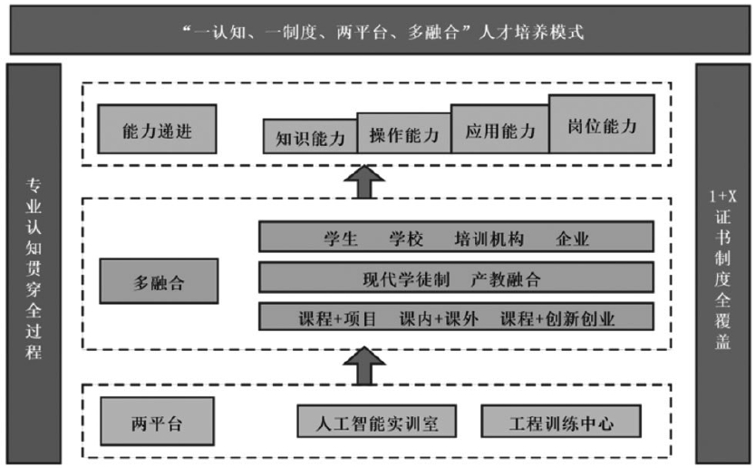 我国人工智能 (AI) 技术服务专业是 2019 年教育部首次增设的目录外新专业,从 2020 年开始招生,高职院校的人才培养模式是坚持以人才培养为核心,以人工智能技术应用为重点,在“重基础、重实践、重素质”的传统教学基础上,结合专业认知及“1+X证书”制度,以学生能力递进为目标,并以人工智能实训室和工程训练中心两大平台为依托,学校、学生、培训机构、企业四方协同,创建课程+项目、课内+课外、课程+创新创业的多融合机制,形成“一认知、一制度、两平台、多融合”人才培养的新模式(见图1)。
