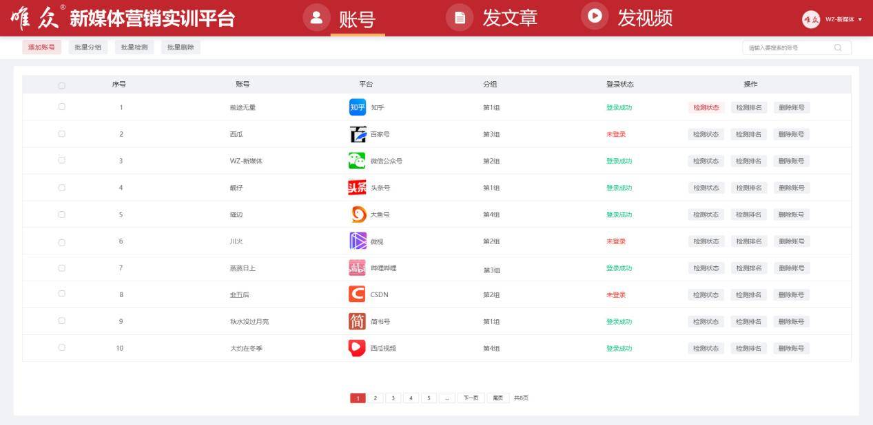 实训平台提供了统一便捷的账号管理功能。用户可以自由添加、删除各平台账号,并进行灵活的账号分组管理。添加账号时,系统会自动检测登录状况,成功登录后还可持续检测账号状态,如登录是否失效等。