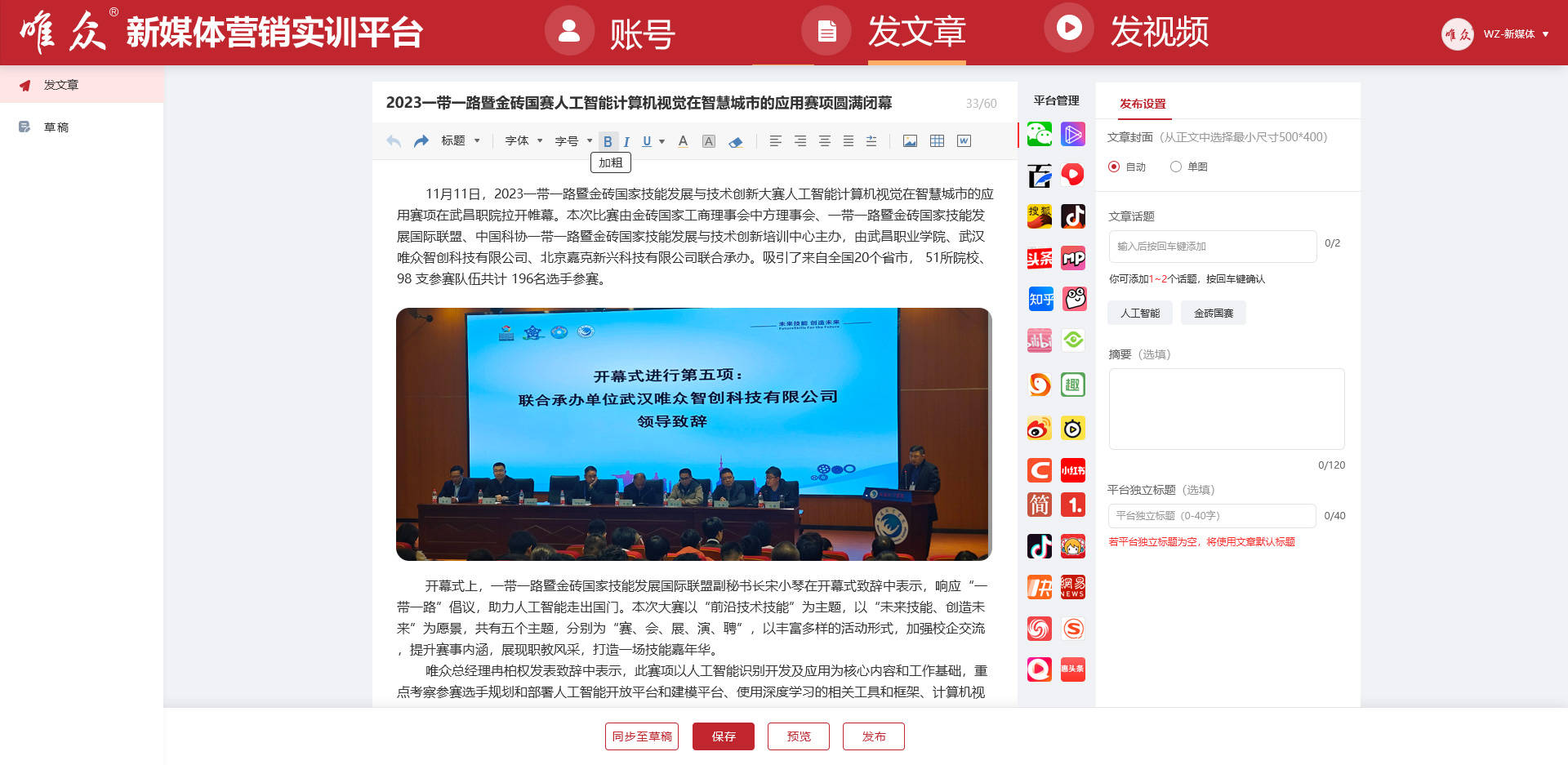 《新媒体营销实训平台》是一款提高文章发布效率的新媒体内容管理工具。用户可以轻松管理账号,使用我们提供的文章编辑器进行编辑和排版。编辑完成后,只需一键发布,即可同时在多个主流新媒体和博客平台发布文章,如百家号、公众号、知乎、CSDN等。