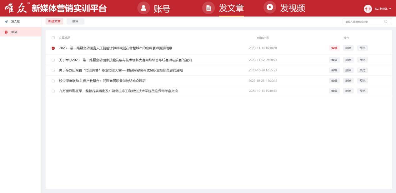 实训平台提供了统一的后台文章管理界面。用户可以轻松查看或删除已发布文章,并查看发布详情如时间、平台和状态等信息,方便管理。另外平台还提供草稿箱功能,用户可以保存草稿,并在草稿箱中查看和编辑所有未发布文章,以提高创作效率。