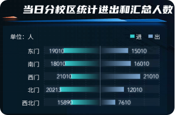 3. 日均分校区通行统计:实时统计今日进出各个校区人次,出校区人次,准确反映不同校区流动状况,便于学校管理者准确、实时了解各校区当前状态,通过信息化手段有效管理流动人员。