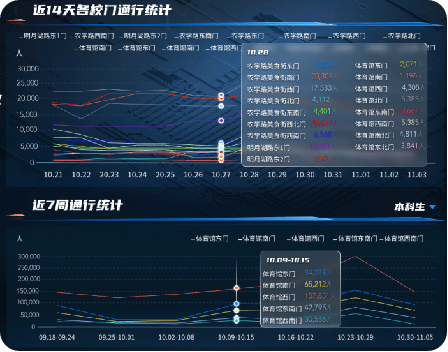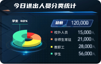 5. 分时段各校门通行统计:通过可视化图表实时直观显示各个校门内每日进出人员数,可提供学生、教职工等各类分项数据展示,为保卫日常管理提供数据保障。