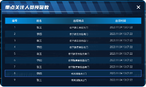 8. 重点人员关注:通过后台设置重点人员黑名单信息,监控系统发现重点人员,可第一时间显示在可视化系统中,为学校提供实时的安全保障。