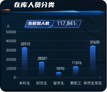 1. 在库人员分类:平台可实现实时统计目前学校在库各类人员数量分布情况,通过柱状图清晰的展示了包括本科生、研究生、教职员工等数量,方便用户能够快速获取各类数据。