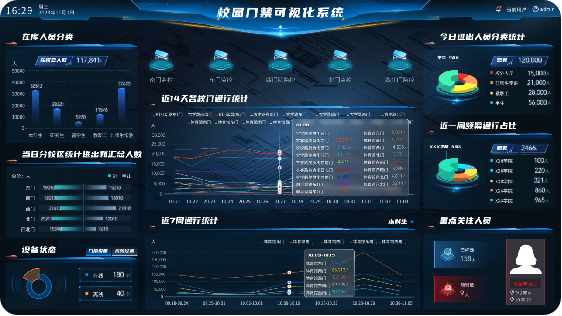 随着科技的持续进步,数字化校园在教育领域中的地位日益上升,各种智能门禁、安防摄像头等已遍布校园各个地方,为师生提供安全便捷的通行体验。然而数据收集分散、缺乏管理、分析困难等问题也逐渐出现,在这个数字化环境中,安防门禁可视化系统的出现在校园中就发挥着关键作用。该系统是一个基于数字技术和数据分析的交互式展示平台,通过高清晰度的大屏幕实时、动态地呈现校园内的各种安防信息数据,包括安防摄像机信息、出入库门禁信息、停车场信息等。通过利用数据可视化技术,将这些复杂的数据转化为直观、易于理解的图形和图像,不仅为学校提供了可靠的数据支撑,也为学校更好地实现智慧化管理。