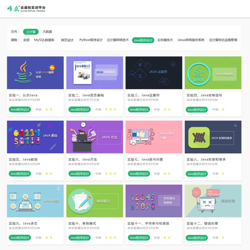 可提供Windows7、Windows8、Windows10、Windows2008、Windows2012、CentOS、Redhat、Ubuntu等主流操作系统,并且用户可自定义镜像,根据需要自行上传。云虚拟平台以少量硬件设备完成大量实训集群的构建,可提供大量学生进行大数据技能相关实训。每个学生的实训环境互相隔离、实训过程互不干扰,即使某些实训环境破坏,对于其他学生也没有影响,方便学生高效的完成实训操作的同时,大幅节省了硬件成本和人力成本的投入。提供集群管理,支持多台主机集群管理,通过弹性云计算方法自动轮询调度虚拟主机。