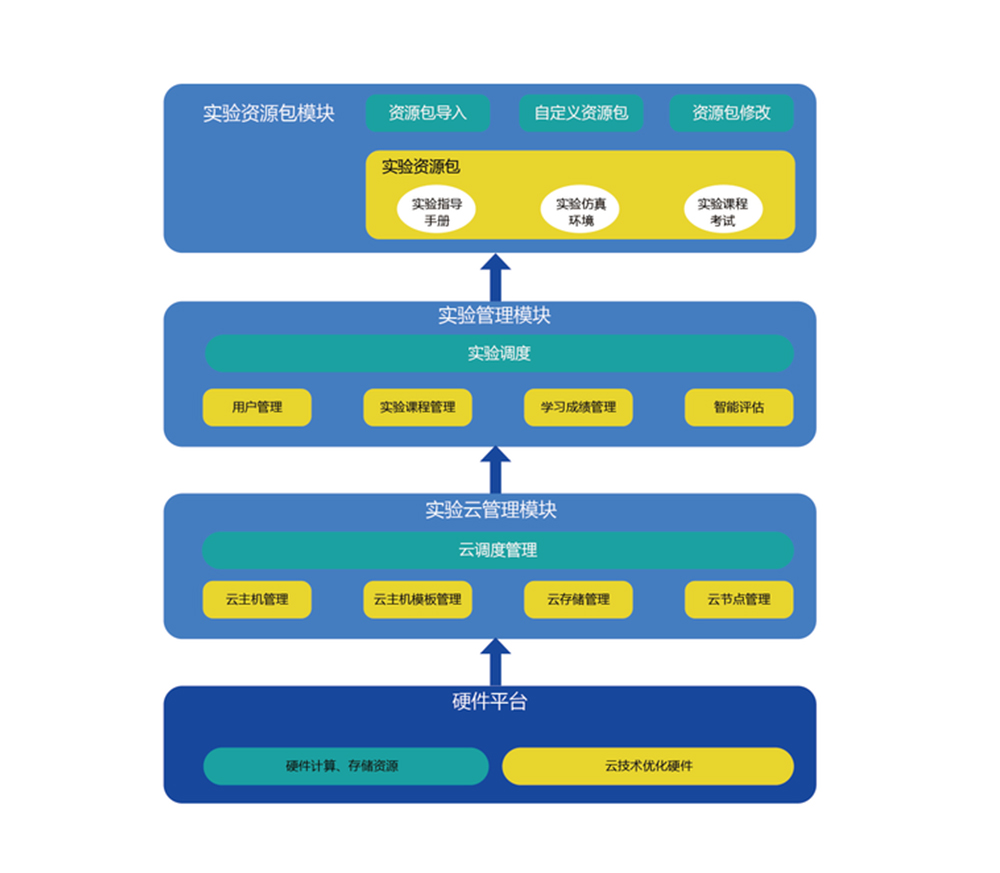 唯众云虚拟实训平台在逻辑上分为四个模块,包括硬件平台,实验云管理模块,实验管理模块,以及实验资源包模块。