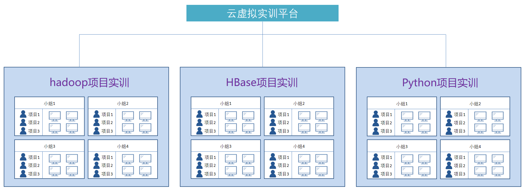 云虚拟实训平台可支撑学校开展实训周、小学期、综合课程设计等形式的项目实训教学活动,支持小组分工协作,可为每个项目小组按需分配一套虚拟服务器集群,集成Hadoop、HDFS、HBase、Hive、Spark等主流的大数据环境,可支撑多个云计算项目实训题目同时开展。
