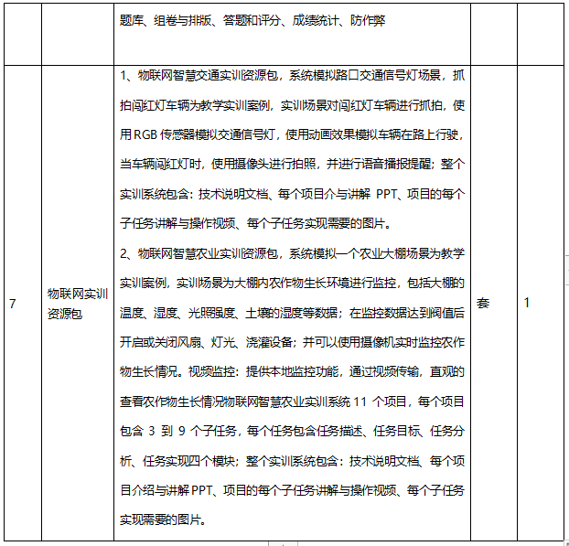 2、物联网智慧农业实训资源包,系统模拟一个农业大棚场景为教学实训案例,实训场景为大棚内农作物生长环境进行监控,包括大棚的温度、湿度、光照强度、土壤的湿度等数据;在监控数据达到阀值后开启或关闭风扇、灯光、浇灌设备;并可以使用摄像机实时监控农作物生长情况。视频监控:提供本地监控功能,通过视频传输,直观的查看农作物生长情况物联网智慧农业实训系统11 个项目,每个项目包含 3 到 9 个子任务,每个任务包含任务描述、任务目标、任务分析、任务实现四个模块;整个实训系统包含:技术说明文档、每个项目介绍与讲解PPT、项目的每个子任务讲解与操作视频、每个子任务实现需要的图片。