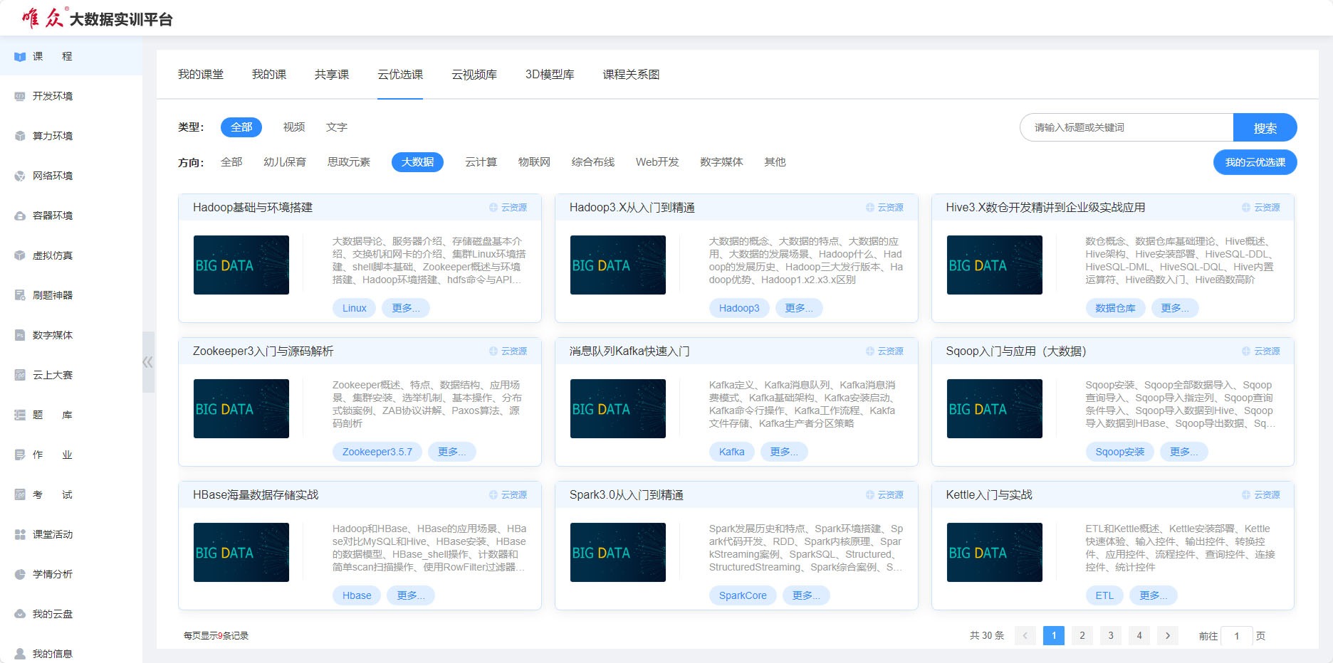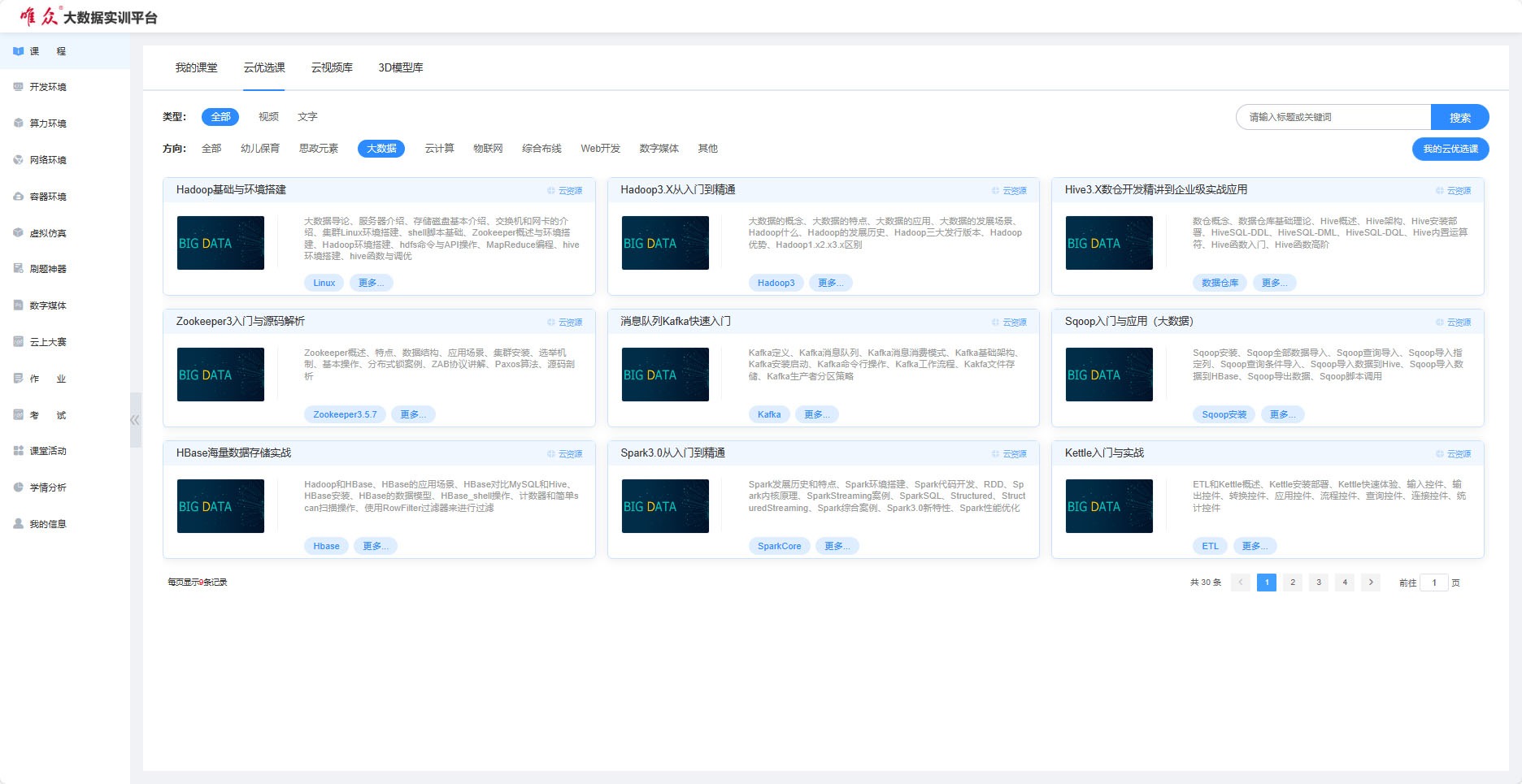 大数据教学资源主要包括以下三个方面:大数据通用类课程、大数据专业类课程以及大数据实训类课程。