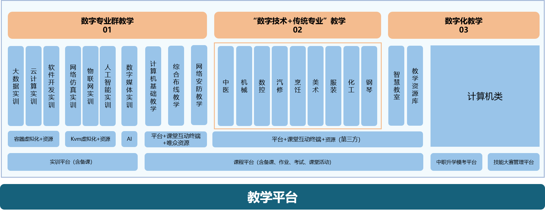 唯众云课堂平台采用微服务架构,精准分为公共基础、公共应用、专业应用服务。把不同的微服务方便进行因材施教和按需施教,可以非常方便实施个性化的教学模式、具体的教学内容、针对性的教学流程,精细赋能计算机基础、综合布线、网络搭建与运维、智能化安防、物联网、嵌入式、移动互联、WEB前端开发、软件应用开发、云计算、大数据、人工智能、创客等数字技术专业群教学和实训基地建设,从而营造动态精准高效的好课堂,助力提质培优、增值赋能高水平职业教学。