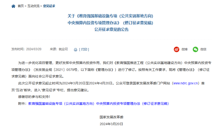 国家发展改革委国家发展改革委关于修订印发《教育强国基础设施专项(公共实训基地方向)中央预算内投资专项管理办法》的通知(修订征求意见稿)