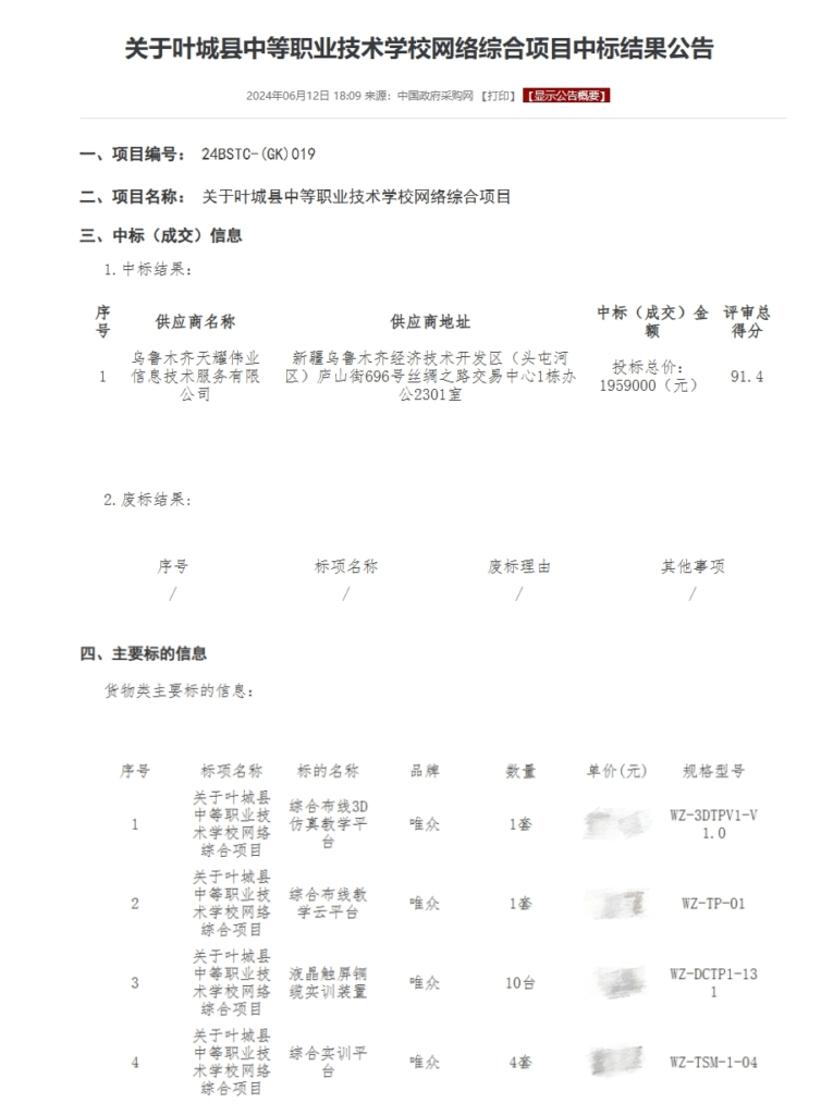 近日,唯众市场捷报频传,产品接连中标全国各地职业教育教学实训项目,彰显其卓越的产品品质、创新的教学理念和深厚的市场影响力。继6月4日唯众品牌产品成功中标贵州食品工程职业学院大数据网络项目后;6月7日,唯众公司独立中标六枝特区职业技术学校的智能家居与计算机组装维护实训室建设项目。6月12日,又一喜讯传来,唯众携手合作伙伴,成功中标叶城县中等职业技术学校网络综合项目。此次网络综合项目的中标,将为学校提供先进的网络综合实训环境,助力学生技能提升,为边疆地区培养更多高素质的技术技能人才。