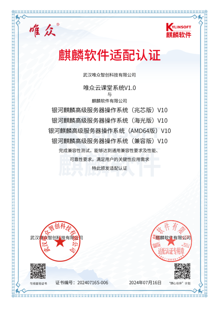 2024年“唯众云课堂”已获麒麟软件适配认证。
