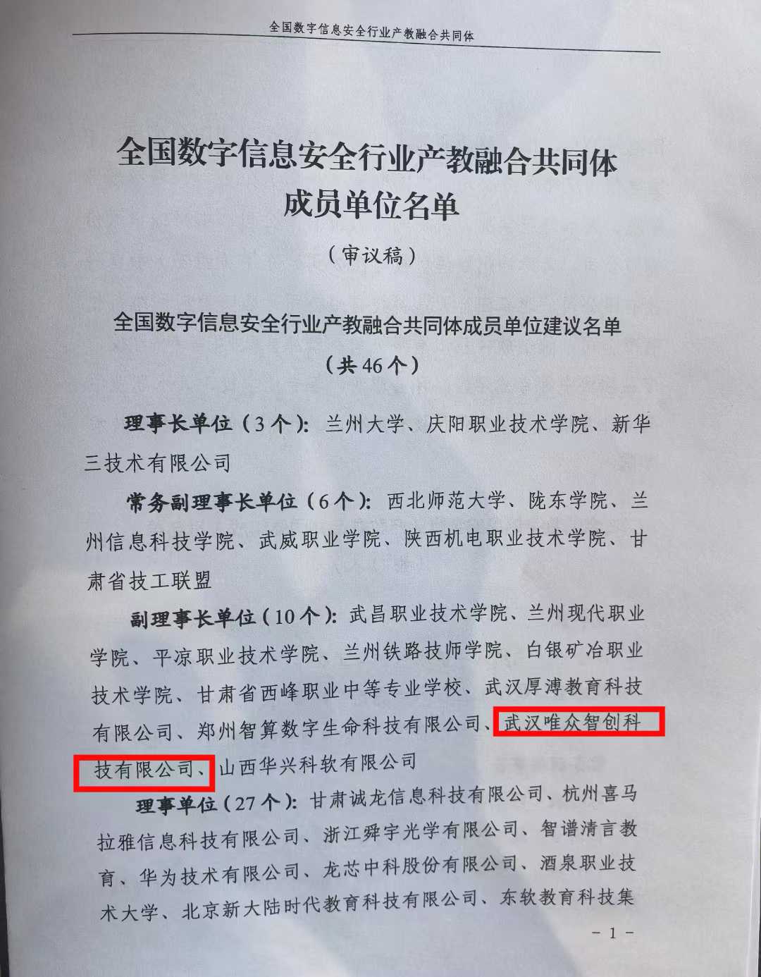 此次与唯众一同当选为副理事长单位的还有武昌职业技术学院、兰州现代职业学院、平凉职业技术学院、兰州铁路技师学院、白银矿冶职业技术学院、甘肃省西峰职业中等专业学校、武汉厚溥教育科技有限公司、郑州智算数字生命科技有限公司、山西华兴科软有限公司等 9 家单位。这些单位在职业教育、科技研发、人才培养等方面各具优势,将共同为共同体的发展出谋划策、贡献力量。