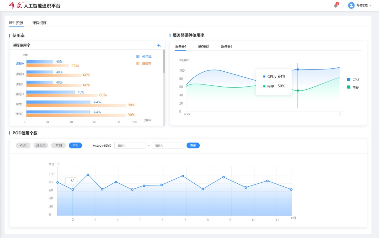 服务器监控:可监控底层服务器的cpu、内存曲线;查看某个时段的实验资源使用数量。