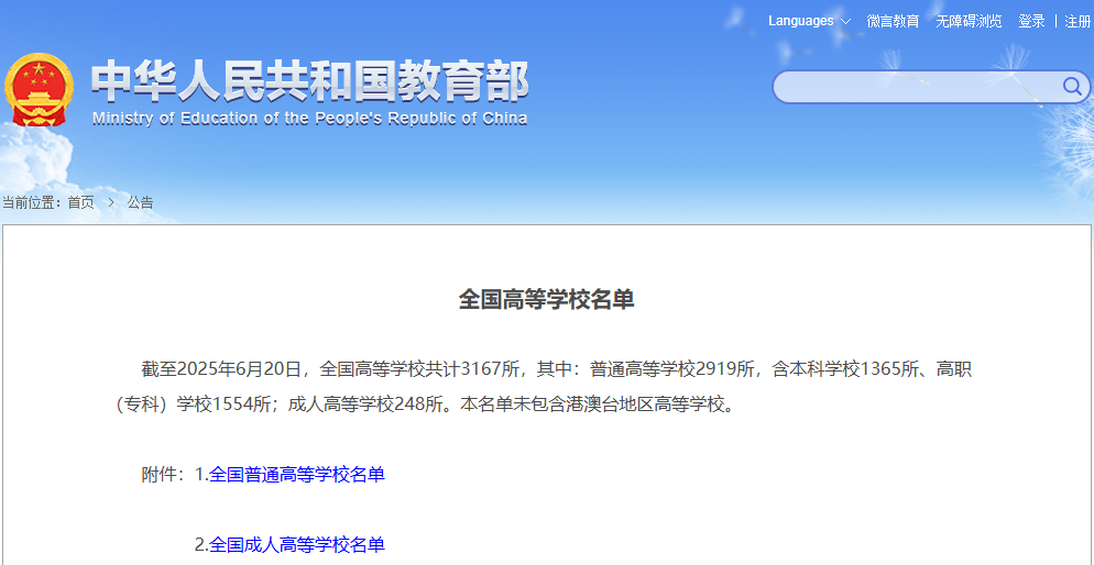 近日,教育部正式发布了最新的《全国高等学校名单》,数据显示,截至2025年6月20日,我国高等学校总数已达到3167所,其中普通高等学校2919所,成人高等学校248所(本名单未包含港澳台地区高等学校)。在普通高等学校中,本科学校有1365所,而高职(专科)学校则达到了1554所,占据了普通高等学校的大半壁江山,彰显了高职(专科)教育在我国高等教育体系中的重要地位。