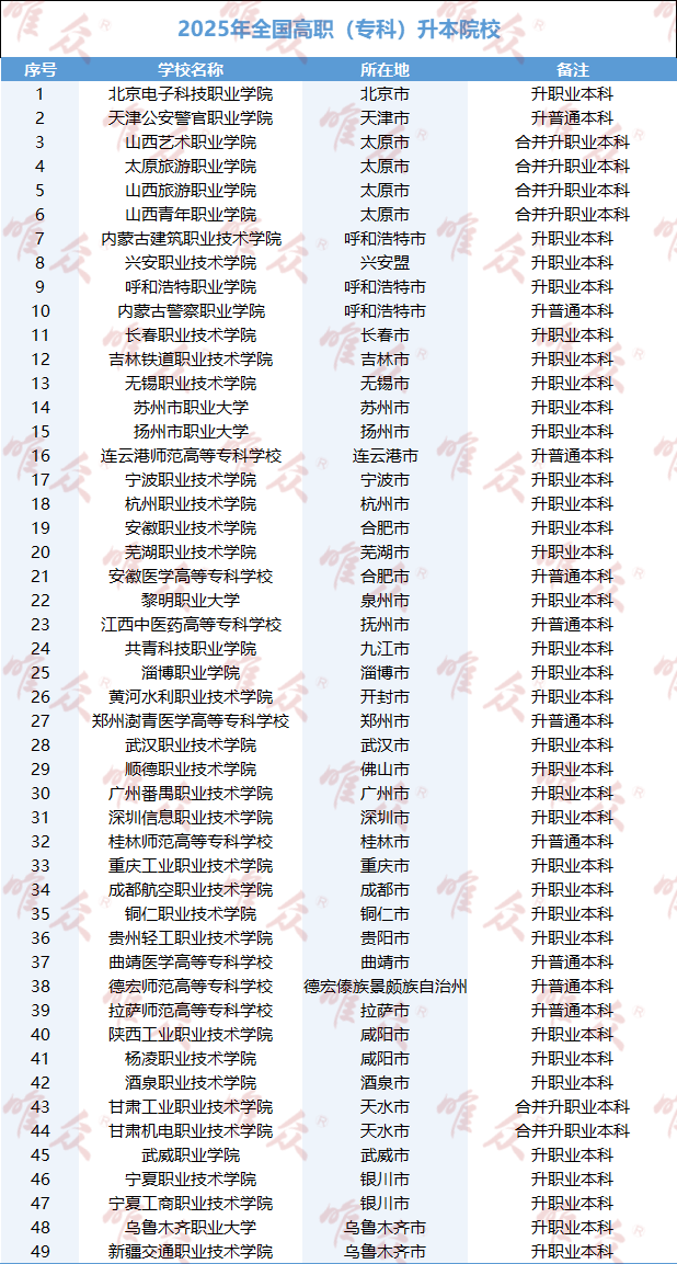 另外,今年全国共有49所高等学校实现了升格(即从专科层次提升至本科层次),反映了高等教育结构的持续优化。这些升格院校具体分为两类:一是 10 所院校直接升为普通本科;二是 39 所院校通过整合资源升格为职业本科,其中 33 所以本校为基础整合资源,山西、甘肃则分别整合 4 所、2 所院校。