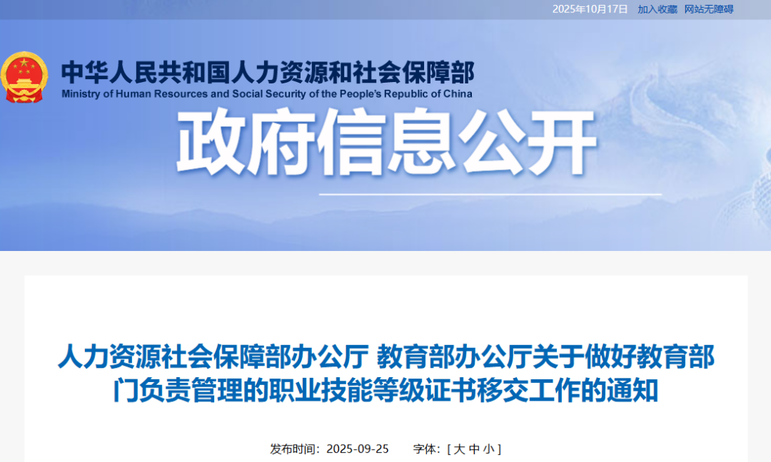 近日,人力资源社会保障部办公厅与教育部办公厅近日联合印发《关于做好教育部门负责管理的职业技能等级证书移交工作的通知》(人社厅函〔2025〕154号),标志着我国技能人才评价体系进入进一步整合与优化的新阶段。