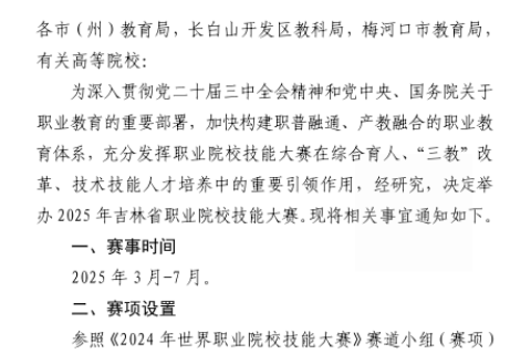 在与世界职业院校技能大赛全面对接的进程中,吉林省也积极采取行动。 为深入贯彻二十届三中全会精神和党中央、国务院关于职业教育的重要部署,加快构建职普融通、产教融合的职业教育体系,充分发挥职业院校技能大赛在综合育人、“三教”改革、技术技能人才培养中的重要引领作用。近日,吉林省教育厅发布了《关于举办2025年吉林省职业院校技能大赛的通知》(以下简称《通知》)。此次大赛不仅是一次职业教育成果的集中展示,更是推动职业院校技能大赛在综合育人、“三教”(教师、教材、教法)改革、技术技能人才培养中发挥重要引领作…
