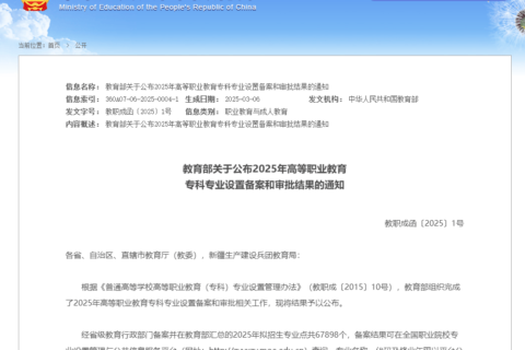 近日,全国职业院校专业设置管理与公共信息服务平台公布了2025年高等职业教育专科专业设置备案和审批结果。数据显示,截至3月21日,2025年高职院校成功备案的专业点共67902个,覆盖人工智能、智能装备、健康养老、新能源等国家战略与民生紧缺领域。 在“新双高”计划的推动下,职业教育迎来了新的发展机遇,其专业设置更加紧密地贴合市场需求与国家战略。其中,人工智能技术应用专业以新增183个备案点的成绩位列新增专业TOP20榜单第二位,充分体现了职业教育对市场需求的敏锐洞察和 快速响应,也反映了“新质生…